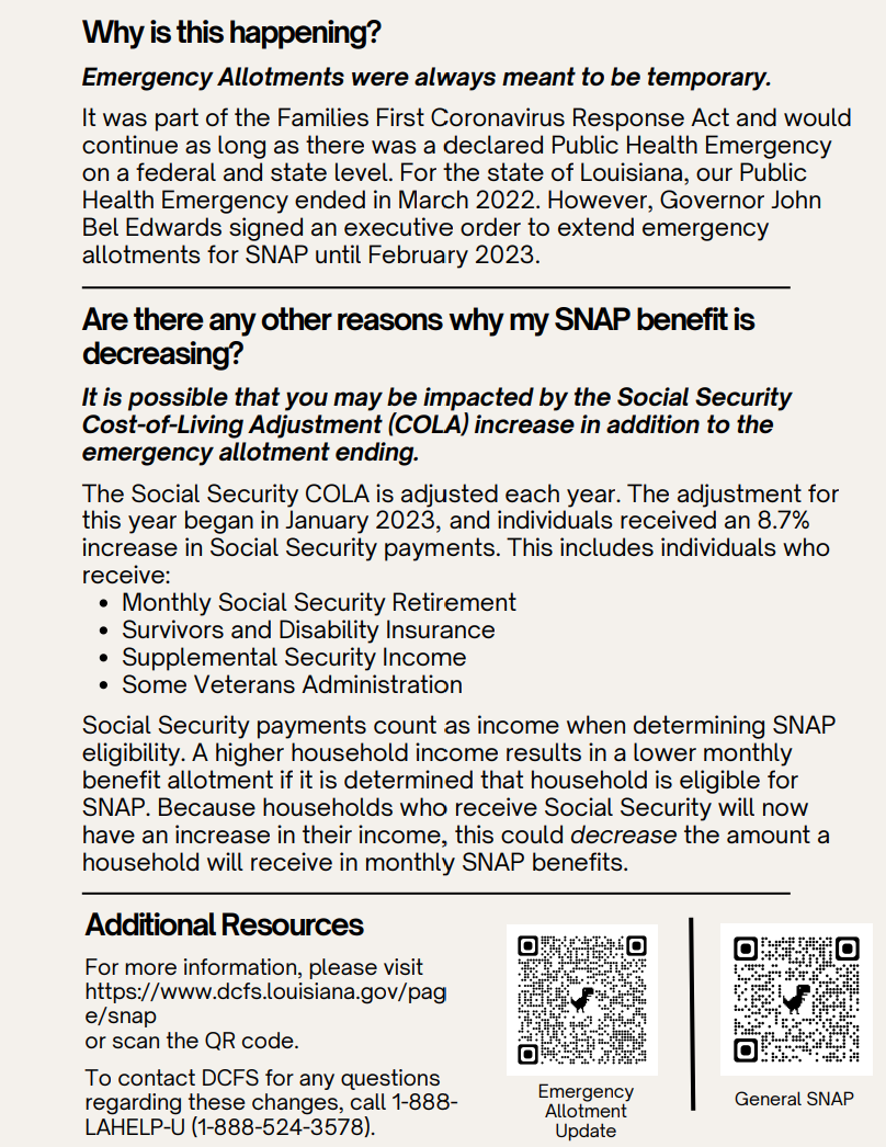 We encourage you to call your local SNAP Agency {Toll-free hotline in Louisiana - (888) 524-3578} to learn how these changes might affect you and your household.