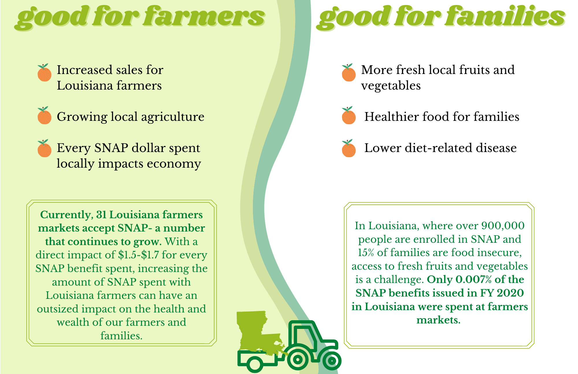 Greaux the Good, BILL HCR57, will provide Louisiana farmers markets and operations with funding to create or expand a market match SNAP program, increasing the number of shoppers at farmers markets and the amount of fresh produce consumed in Louisiana, which will create a mutual benefit of positively impacting the state's agricultural economy and farmers while helping to decrease the food insecurity of some of the most vulnerable populations.